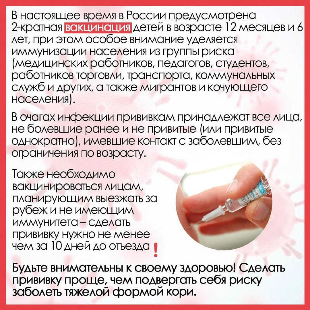 Своевременно обращайтесь за медицинской помощью при возникновении заболевания, чтобы избежать осложнений и не заразить окружающих. Сделать прививку и предупредить заболевание или облегчить течение болезни проще, чем подвергать себя риску заболеть тяжелой формой кори.