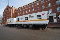 В автопоезде Черняховской ЦРБ работает цифровой маммограф с высоким разрешением. Кабинет размещен на шасси специального типа. В прицепе находится три полноценных врачебных кабинета, которые будут комплектоваться в зависимости от задач, решаемых в населенном пункте или учреждении, куда направляется комплекс. Планируется, что передвижной маммограф будет обслуживать по графику население сельских территорий Черняховского и соседних муниципалитетов. За праздничные дни комплекс, который работал на площади Ленина в окружном центре, посетили 60 человек.